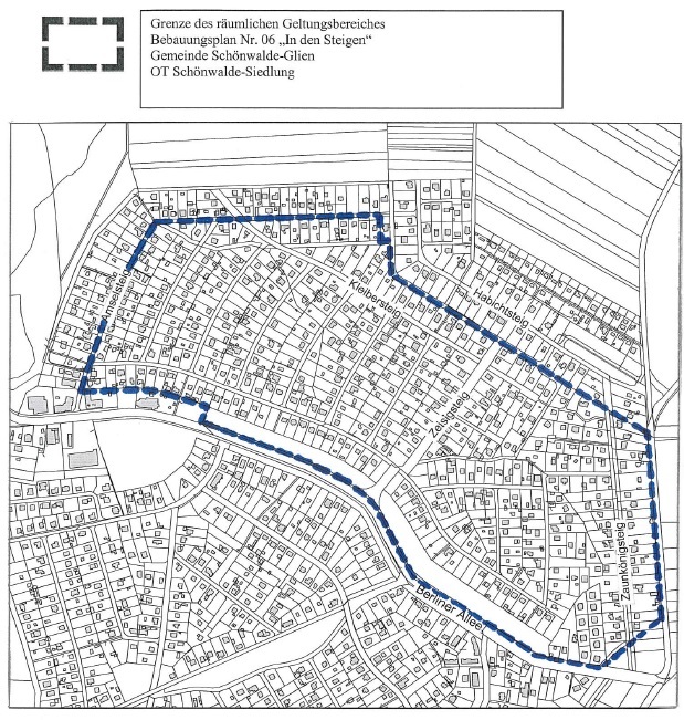 Der von der Gemeindevertretung der Gemeinde Schönwalde-Glien in der Sitzung am 21.03.1996 unter der Drucksache Nr. 40 / 96 als Satzung beschlossene Bebauungsplan Nr. 06 „In den Steigen“ für das Gebiet in der Ortslage Schönwalde-Siedlung, bestehend aus der Planzeichnung und dem Text, für das ca. 55,1 ha große Gemeindegebiet wird gemäß § 10 Abs. 3 Baugesetzbuch (BauGB) in der zur Zeit gültigen Fassung hiermit erneut bekannt gemacht.