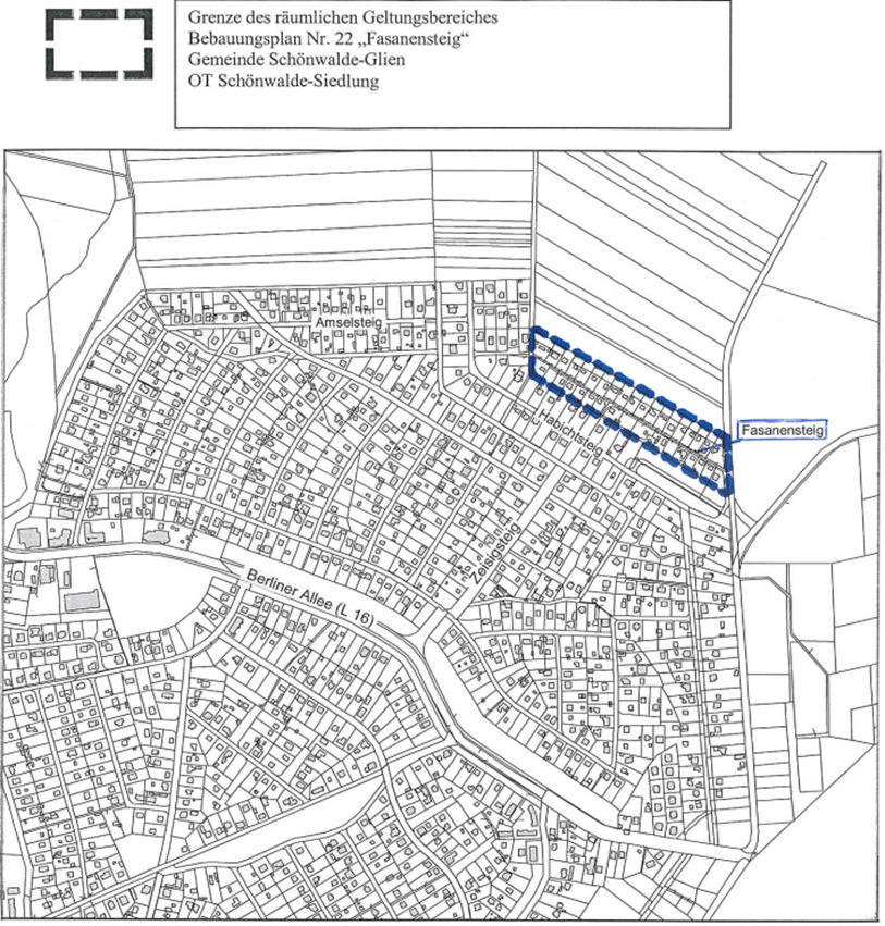Der von der Gemeindevertretung der Gemeinde Schönwalde-Glien in der Sitzung am 18.09.2025 unter der Drucksache Nr. 125/2024 als Satzung beschlossene Bebauungsplan Nr. 22 „Fasanensteig“, 1. Änderung, für das Gebiet in der Ortslage Schönwalde-Siedlung, bestehend aus der Planzeichnung und dem Text wird gemäß § 10 Abs. 3 Baugesetzbuch (BauGB) in der zur Zeit gültigen Fassung hiermit bekannt gemacht.