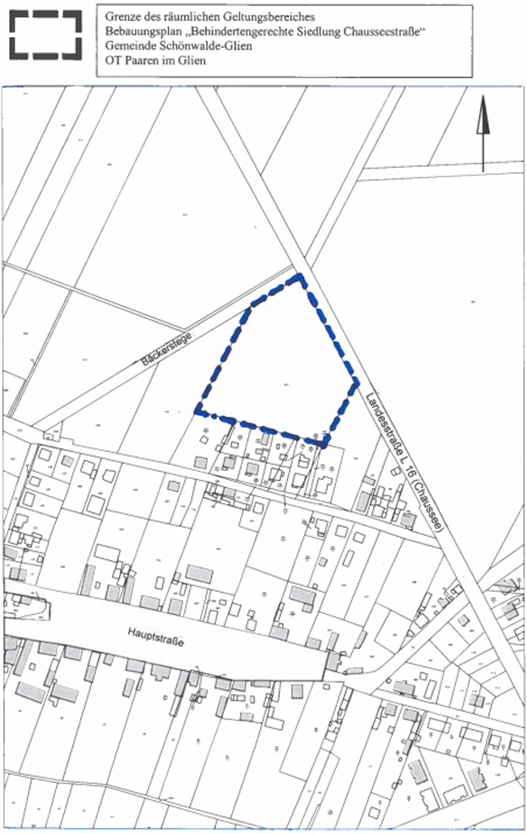Der von der Gemeindevertretung der Gemeinde Schönwalde-Glien in der Sitzung am 18.09.2025 unter der Drucksache Nr. 076/2025 als Satzung beschlossene Bebauungsplan „Siedlung Chausseestraße“, 1. Änderung (Ursprungsbebauungsplan „Behindertengerechte Siedlung Chausseestraße“), für das Gebiet in der Ortslage Paaren im Glien, bestehend aus der Begründung und textlichen Festsetzung zum Bebauungsplan sowie des Ursprungsbebauungsplans wird gemäß § 10 Abs. 3 Baugesetzbuch (BauGB) in der zur Zeit gültigen Fassung hiermit bekannt gemacht.