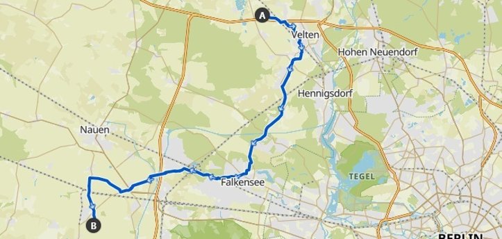 Die Tagesetappe am 3. Juli beginnt in Schönwalde und führt über Falkensee, Brieselang, Nauen und Ketzin bis nach Etzin. Von Bötzow kommend läuft Sie entlang der Bötzower Straße und weiter nach Falkensee die Falkensseer Straße entlang.