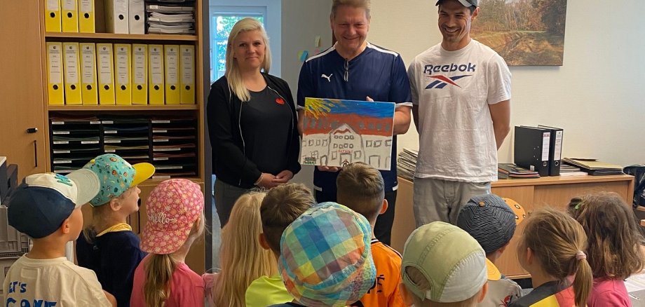 Ein besonderes Highlight war ein gemeinsam gestaltetes Bild des Rathauses mit dem Bürgermeister im Vordergrund, das die Kinder extra für den Bürgermeister gemalt und ihm bei einem Besuch im Rathaus persönlich überreicht haben – ein symbolischer Moment, der bei allen Beteiligten für große Freude sorgte.