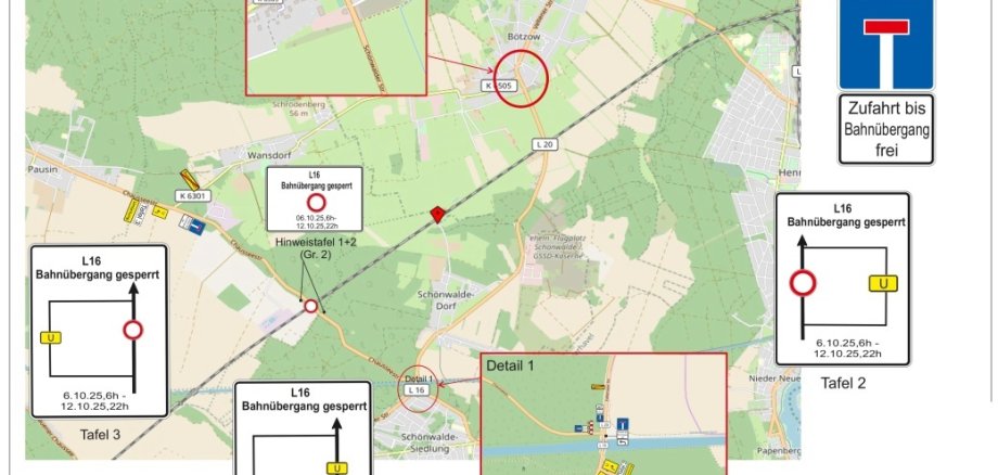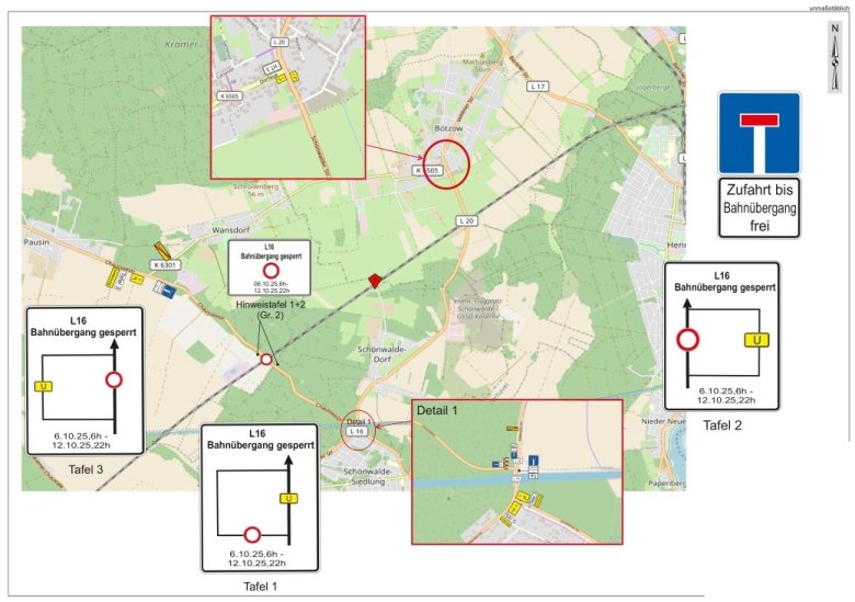 Während der Bauarbeiten wird der Verkehr über ausgeschilderte Umleitungen geführt. Wer aus Richtung Pausin nach Schönwalde-Siedlung fahren möchte, wird über Wansdorf und Bötzow geleitet. In der Gegenrichtung führt die Umleitung über Bötzow, Wansdorf und Pausin zurück.